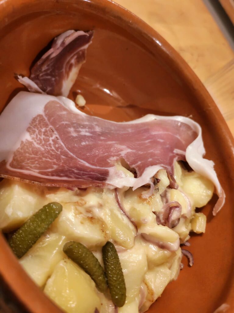 Pommes de terre fondantes, lardons, mélange de tome fraîche et cantal jeune, offrant une texture filante et un goût authentique. Accompagnée de jambon sec d'Auvergne tranché et servi avec le repas.